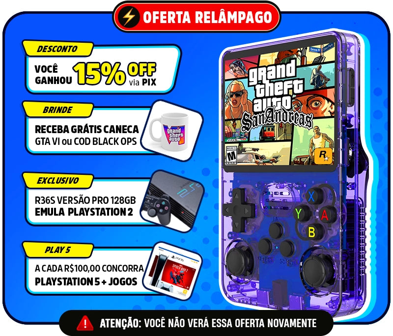 Sim, o R36S possui uma bateria recarregável de longa duração, permitindo até 6 horas de jogo contínuo.